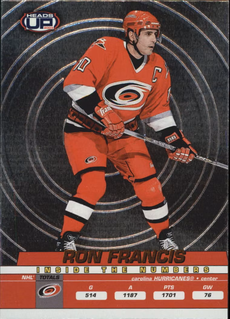 2002-03 Pacific Heads Up Inside the Numbers #6 Ron Francis (10-454x6-HURRICANES) 10 kr In stock Add to cart Stock: 1 Article Number: 25458 Share