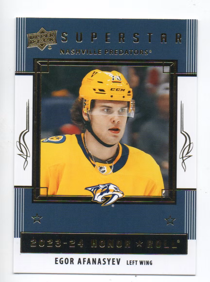 2023-24 Upper Deck Honor Roll #HR66 Egor Afanasyev (10-Q15-PREDATORS) $1.11 In stock Add to cart Stock: 1 Article Number: 28167 Share