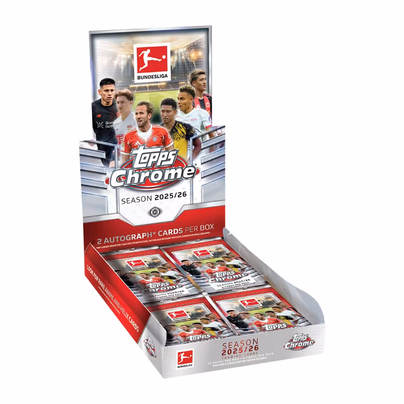 With bold Chrome® imagery, expansive parallel rainbows, and a powerful autograph lineup, Topps Chrome® Bundesliga 2025/26 delivers an unmatched ripping experience worthy of the Bundesliga.