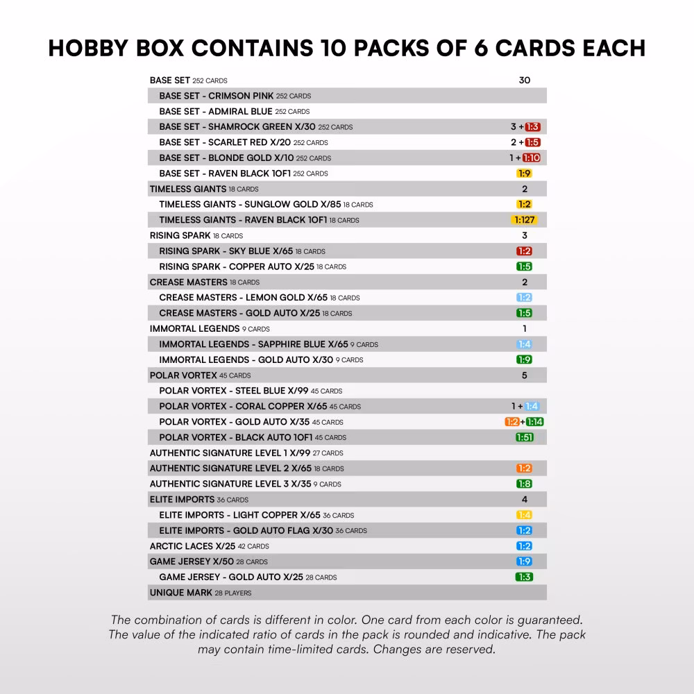 The hobby box is guaranteed to include: 30 x Base Set, 3 x Base Set – Shamrock Green x/30, 2 x Base Set – Scarlet Red x/20, 1 x Base Set – Blonde Gold x/10, 2 x Timeless Giants, 3 x Rising Spark, 2 x Crease Masters, 1 x Immortal Legends, 5 x Polar Vortex, 1x Polar Vortex – Coral Copper x/65, 4 x Elite Imports.