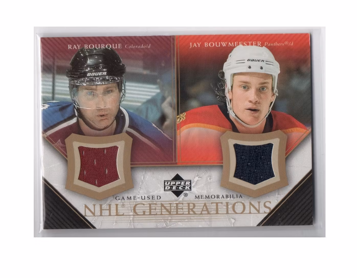 2005-06 Upper Deck NHL Generations #DBB Ray Bourque Jay Bouwmeester (50-X227-GAMEUSED-AVALANCHE-NHLPANTHERS)